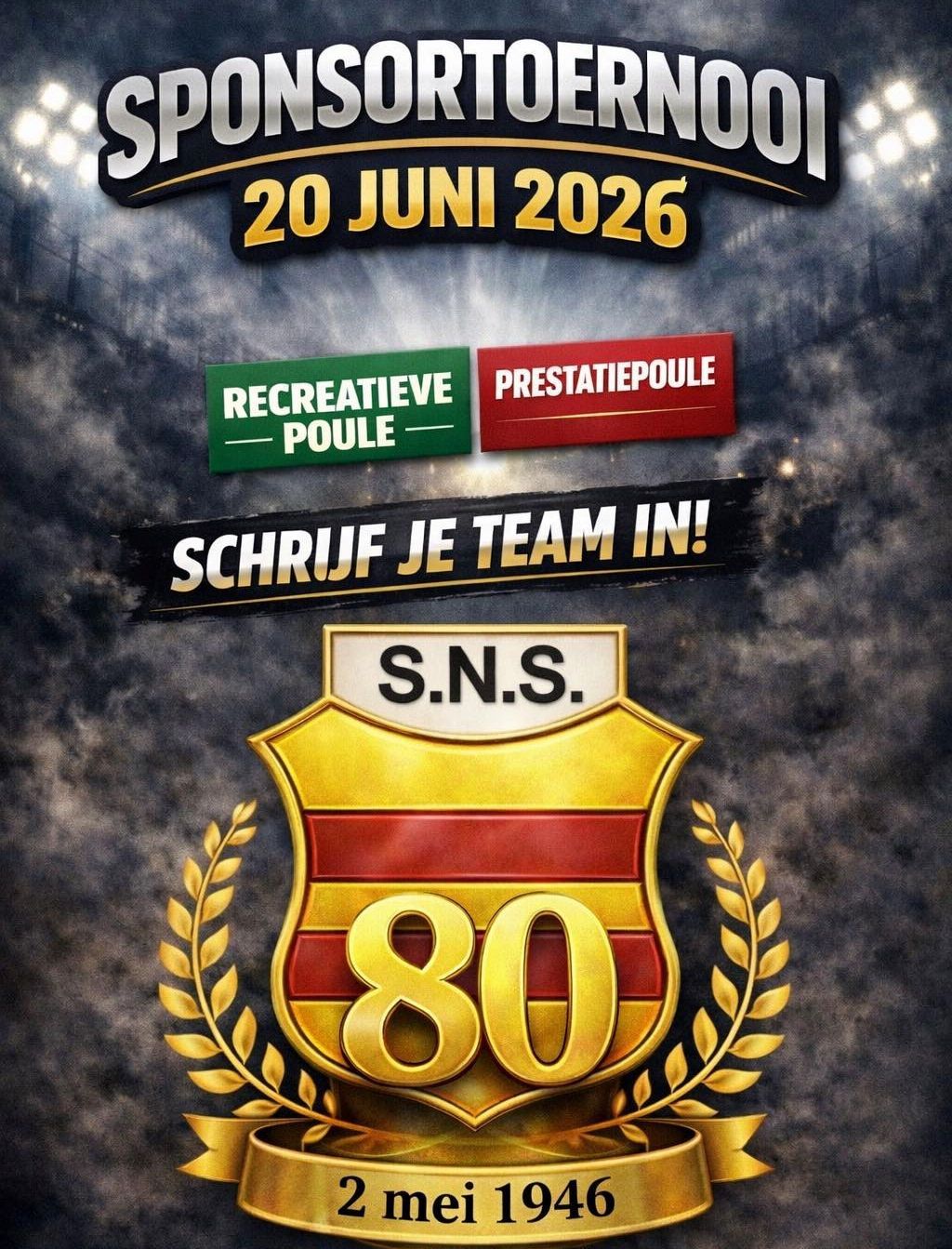 Op 4 juli 2026 bereikt onze mooie vereniging een mijlpaal waar we met recht trots op mogen zijn: SNS bestaat 80 jaar! Acht decennia vol passie, sportiviteit en vooral heel veel onvergetelijke momenten op en rond het veld. Wat in 1946 begon, is uitgegroeid tot een warme club waar generaties elkaar ontmoeten. Of je nu jarenlang in het eerste hebt gestreden, als vrijwilliger de handen uit de mouwen steekt, of pas net je eerste meters op het veld maakt: jij bent SNS. En daarom willen we dit bijzondere jubileum samen met jou vieren. Wat kun je verwachten? We maken van zaterdag 4 juli een dag om nooit te vergeten. Het wordt een dag vol: Herinneringen : Haal samen met (oud-)leden herinneringen op aan legendarische wedstrijden en gezellige derde helften. Activiteiten : Een programma voor jong en oud (details volgen snel!). Gezelligheid : Een hapje, een drankje en de onmisbare S.N.S.-sfeer. Zet het in de agenda! Dit feest wil je niet missen. Of je nu een actief lid bent, een trouwe supporter of een oud-bekende die de club een warm hart toedraagt: je bent van harte welkom. Datum : 4 juli 2026 Locatie : Ons vertrouwde sportcomplex Sfeer : Feestelijk, nostalgisch en bomvol gezelligheid Houd de website en onze socials in de gaten voor het volledige programma. We kijken ernaar uit om samen met jullie het glas te heffen op 80 jaar geschiedenis én op de toekomst van onze club. Tot 4 juli!